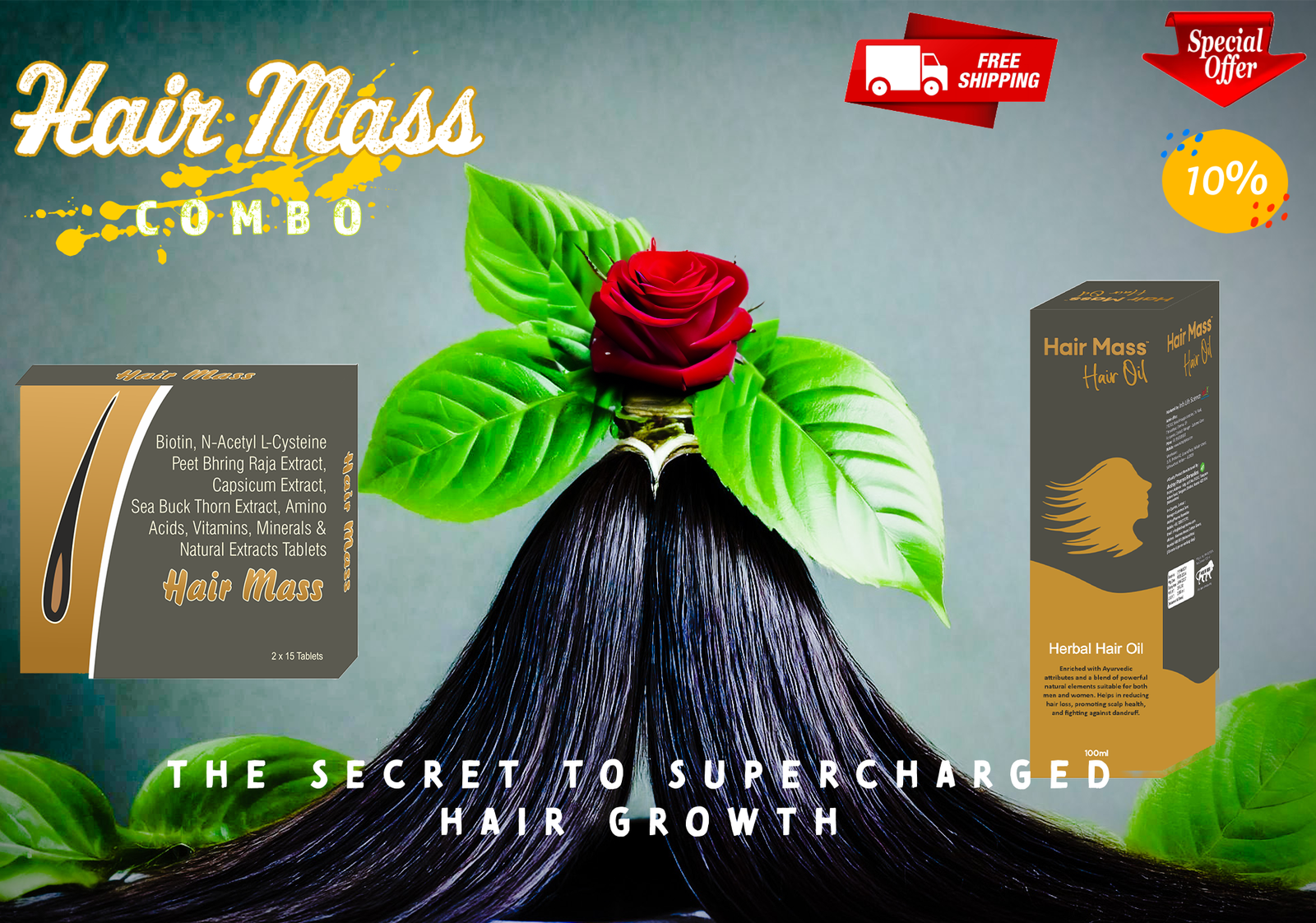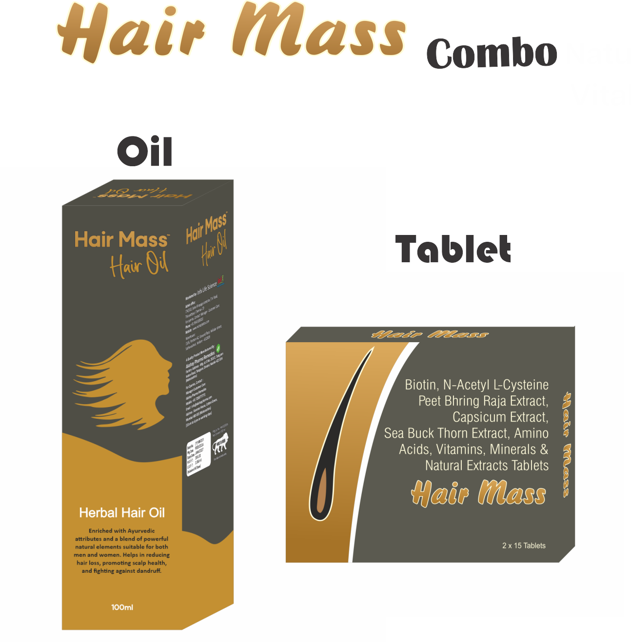Hair Mass Tablet: Peet Bhring Raja Extract, Capsicum Extract, Sea Buck Thorn Extract, Grape Seed Extract, Biotin, Amino Acid Complex, Vitamins (C, E, Niacin, Pantothenic Acid, Folic Acid), Minerals (Copper, Selenium, Iron, Calcium, Magnesium, Zinc).